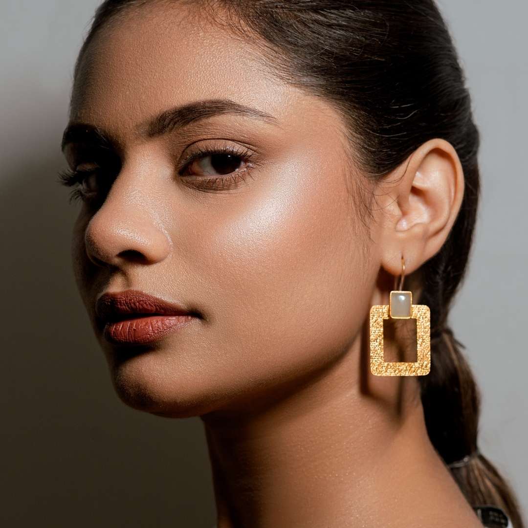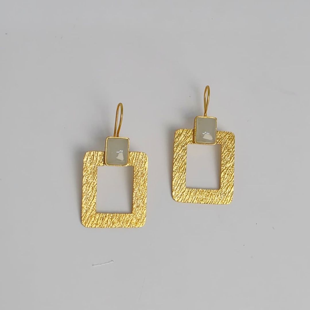 Bold gold earrings with a geometric flair and rich green accent. Sleek, stylish, and perfect for modern elegance.