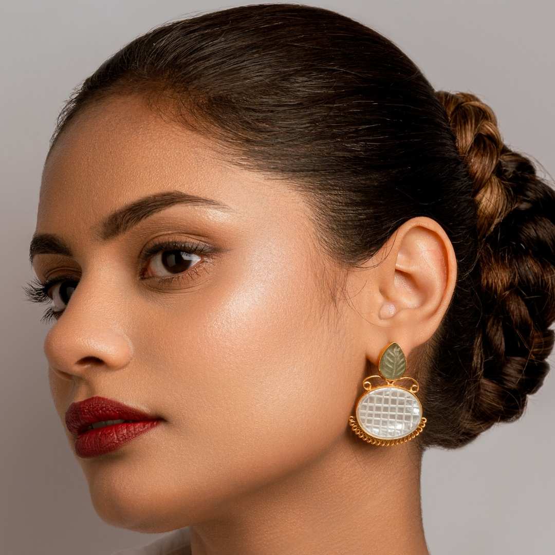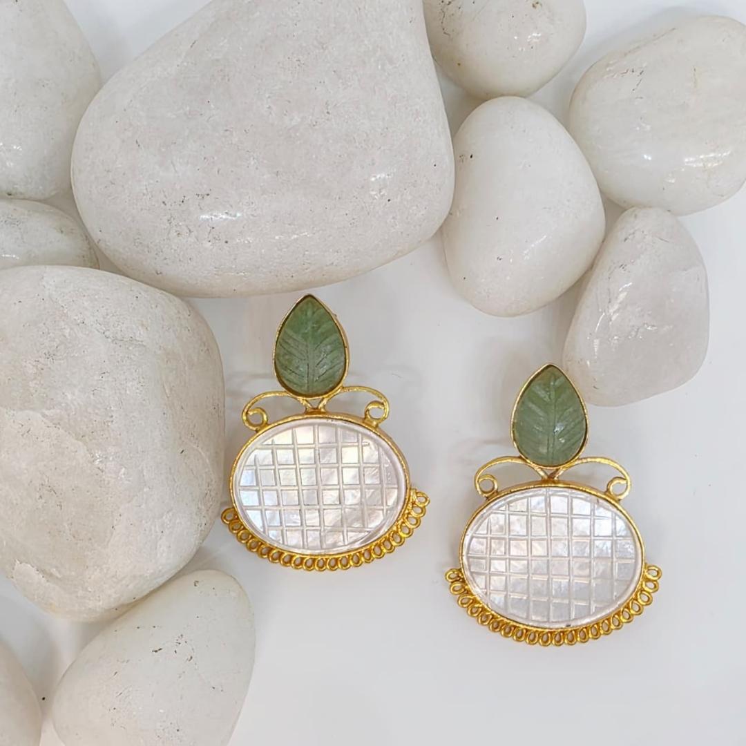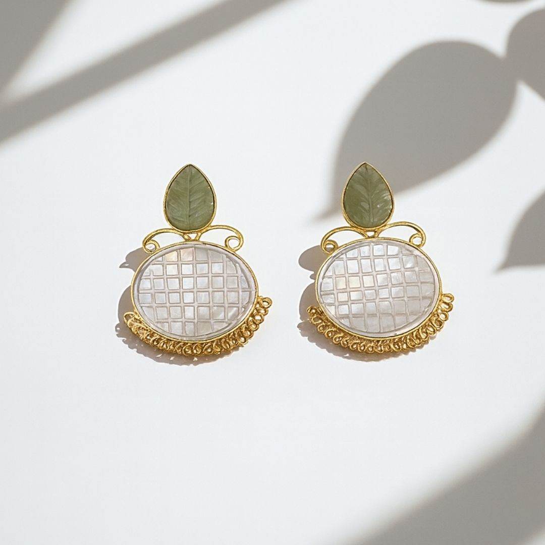 A subtle blend of carved white stone and soft green accents, finished with gold detailing. Lightweight and refined—perfect for everyday elegance.