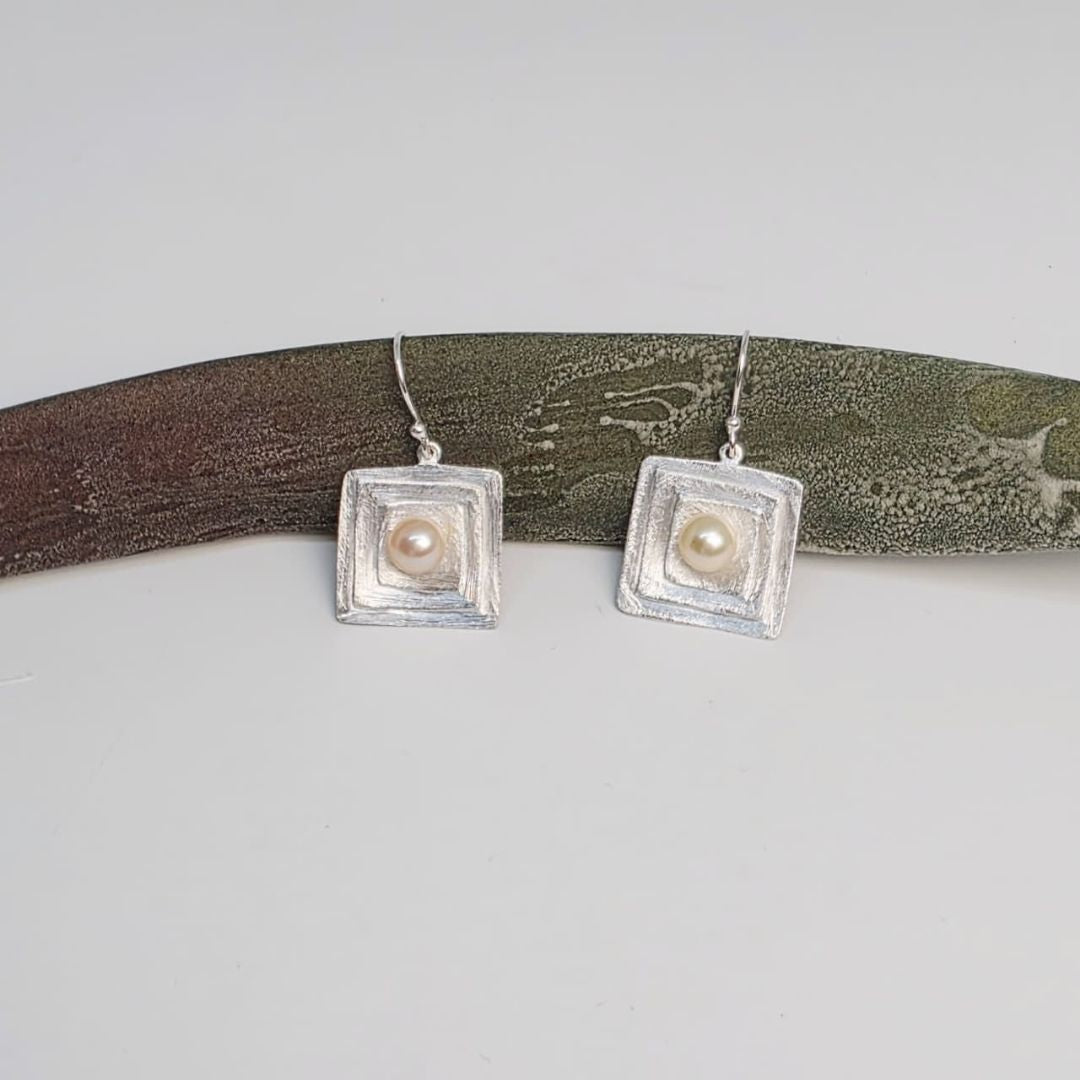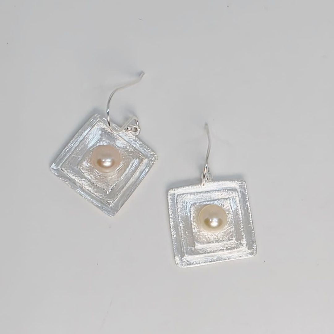 Geometry meets glow—a bold square silhouette softened by a central pearl. it’s light on the ear but heavy on style.